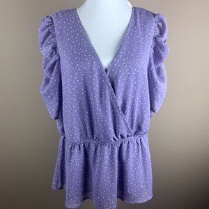 Maurices Short Sleeve Blouse Plus Size 1X Lavender Purple with White Polka Dots, V-neck Faux Wrap with Hook Closure, Puff Shoulder with Elastic Ruching Down Semi-sheer Sleeve, Lined Body, Elastic Peplum Waist