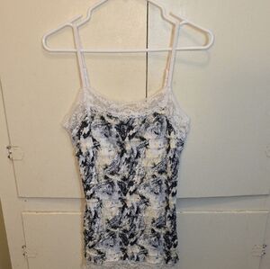 This Maurices tank top is perfect for adding a touch of romance to your wardrobe. The black and white abstract print gives it a modern edge, while the horizontal ruffles and delicate white lace trim add a soft, feminine touch.