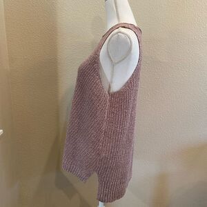 Cozy sleeveless knit sweater in a soft mauve hue. Perfect for layering or on its own. The sweater is in like new condition measures 25 inches from shoulder to front him 29 inches from shoulder to back him and 16 inches pit to pit laying flat perfect for all occasions and in like new condition.