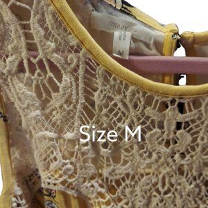 Maurices sleeveless top in very good used condition. No rips or tears. The front top has a crocheted design. The back has a button at the top following by a keyhole opening. Nice flowy bottom. Soft yellow with flowers throughout. Great top for summer.