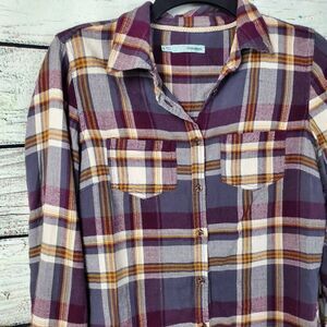 Maurices Small Plaid Button Down Shirt Purple Mustard Gray Long Sleeve Cotton Bl
