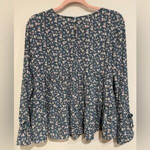 Maurices Smokey Teal Ditzy print blouse. Babydoll style with pheasant sleeves with ties. Keyhole closure.