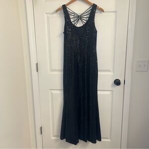 Chic black maxi dress with shimmering details. Sleeveless with unique back design.