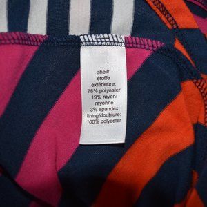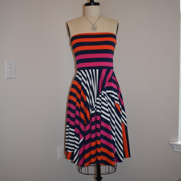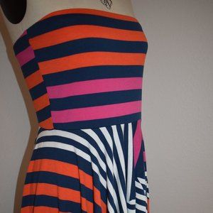 Sundress by Maurices may have been worn once, maybe twice, if that! The graphic navy, white, hot pink & tomato red patchwork stripes are so cute and flow beautifully in different directions. Lined bodice. This would be an absolute perfect summer outfit to pair w/a floppy wide-brim hat, white clutch and strappy heels