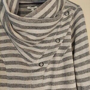 Maurices Sweater Sweatshirt /Knit Type Material ~ Size Large. Has a large collar that can be worn snapped closed in flat in front, as a Cowl Neck, Worn with collar, or open front. Snap Buttons, Versatile, Gray and White Stripe. So cute!