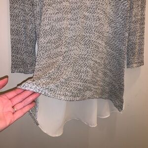 The front of this top and the sleeves are a light black and white knit, and the back looks like a white chiffon!