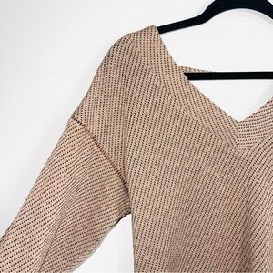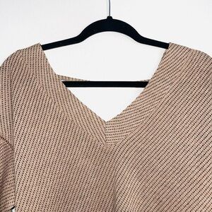 Maurices tan & black printed pullover sweater. In excellent condition! V neckline. Long blouson sleeves. Fitted cuffs. V open back with a strap across the middle. Sweatshirt material. Tan with small black dot print. Size small.