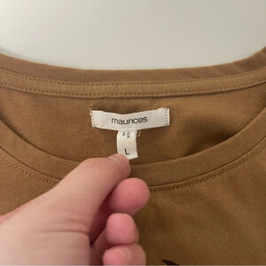 Maurices brown Ski Lodge velvet graphic tee. In excellent condition! Crew neckline. Short sleeves. Rounded bottom hem. Dark brown velvet Ski Lodge graphic on the front. Caramel brown color. Size large.