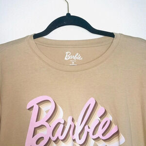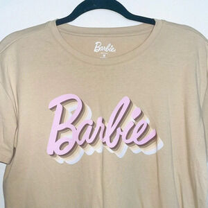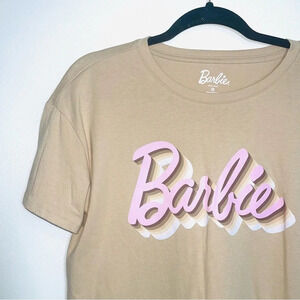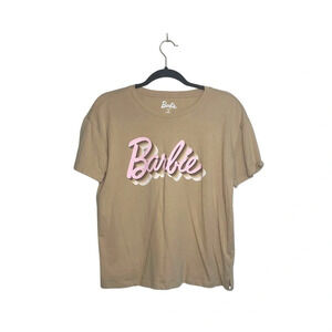 Maurices tan & pink Barbie logo graphic tee. In excellent condition! Crew neckline. Short sleeves. Straight bottom hem. Hip length. Tan with pink & white Barbie logo on front. Size medium.