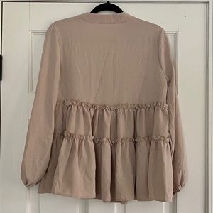 Stylish tan blouse with ruffle details. Long sleeves and V-neck design. Perfect for casual wear.