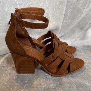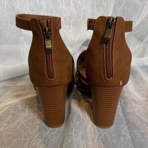 Chic tan heels with strappy design. Perfect for versatile styling. Worn one time. One small imperfection as seen in photo.