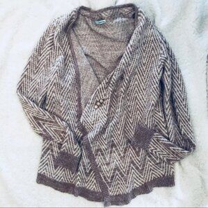 Maurices Tan/White Soft Chevron Stripe Open Waterfall Drape Cardigan Sweater - neutral, earth tones colors, super soft and fuzzy, stretchy, flattering, casual and cozy/comfy. Long sleeve, drapey cardigan. Aztec/tribal print. Light purple tint.