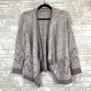 Maurices Tan/White Soft Chevron Stripe Open Waterfall Drape Cardigan Sweater - neutral, earth tones colors, super soft and fuzzy, stretchy, flattering, casual and cozy/comfy. Long sleeve, drapey cardigan. Aztec/tribal print. Light purple tint. Soft, lightweight fabric that pairs effortlessly with jeans, leggings, or dresses. Tags- layering piece, cozy sweater, boho style, casual chic, women’s clothing, holiday, winter, party, cozy, cabin, weekend getaway.