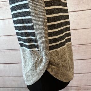 ✨ Stay cozy and chic with this stylish three-quarter sleeve pullover sweater from Maurices in size small! This unique sweater features a beautiful color-block design, with olive green at the top and sleeves, a navy and gray pinstripe in the middle, and a soft gray at the bottom.