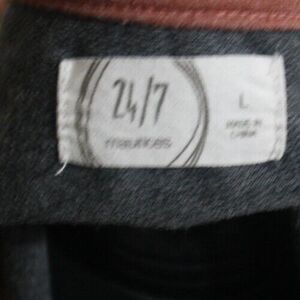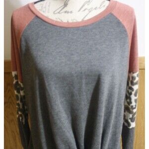 Maurices 24/7 LS pullover top, size large. Knot tie front with leopard color block sleeves and a round neck. Polyester blend machine washable knit material. Good pre-owned condition, no stains, rips, or tears.