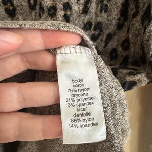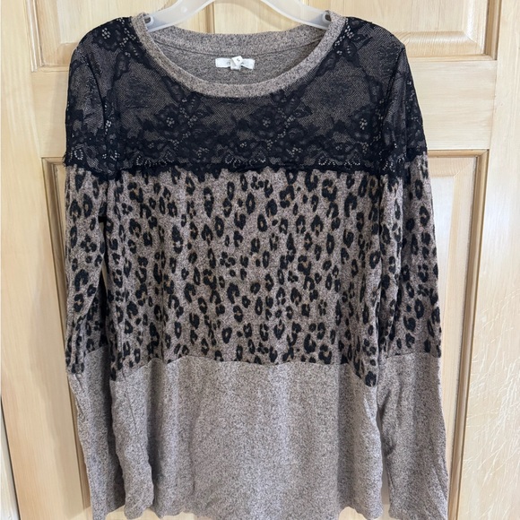 Chic long sleeve top with leopard print. Features elegant black lace detail. Perfect for a stylish look.