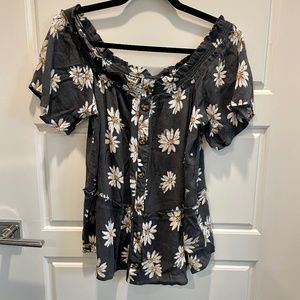 Maurices Top, Size L, EUC. Gray pullover top with decorative buttons. Wear off shoulder or on shoulder. Daisy print on gray background. Peplum ruffle at bottom. Measures: 18" arm pit to arm pit and 19" length.