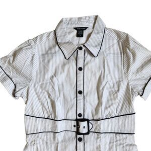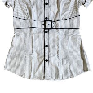 Brand: Maurices. Occasion: Casual, Work, Office. Size Type: Regular. Size (Women's): S. Material: 97% Cotton, 3% Spandex. Neckline: Collared. Style: Button-Front. Sleeve Length: Short Sleeve. Color: White, Black. Pattern: Pinstripe. Features: Built-in Belt with Buckle, Black Piping Trim, Button-tab Cuffed Sleeves, Curved Hem.