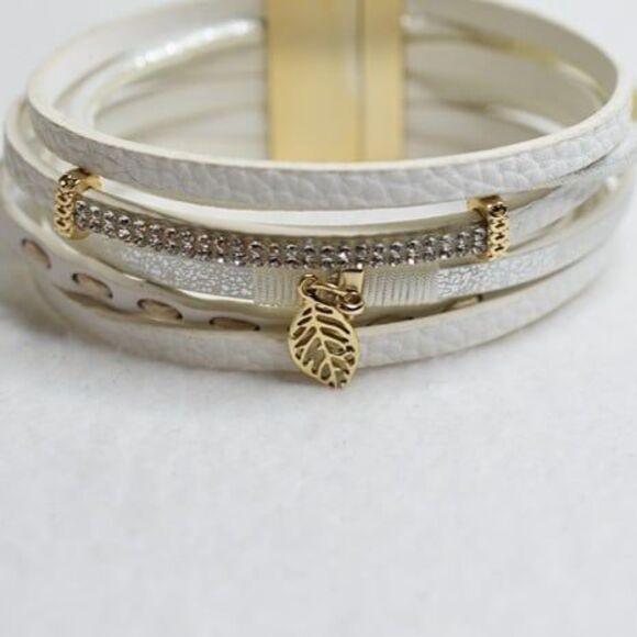 Maurices White Multi Layed Leather Feather Charm Rhinestone Magnetic Bracelet
