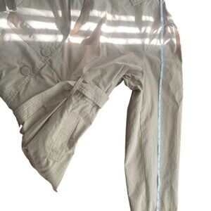 A single breasted, knee-length trench coat jacket in a neutral tan color that features a belted, fitted bodice and flared, pleated skirt – a timeless design that’s sure to compliment anything you choose to wear it with.