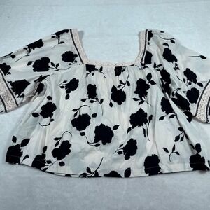 Keywords: Maurices, Floral blouse, Square neck top, Crochet trim, Plus size 2X, Bohemian style, Women's blouse, Black floral print, Cream top, Three quarter sleeves, Casual blouse, Summer top, Lightweight blouse, Boho top
