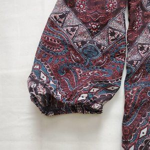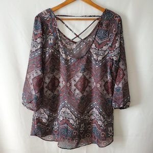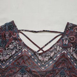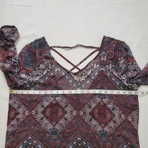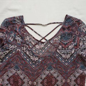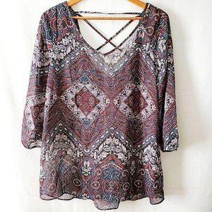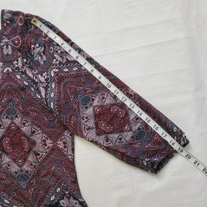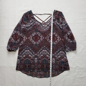 Maurices Women’s 3/4 Sleeve Lattice Back Tunic Blouse Burgundy/Teal Size Large