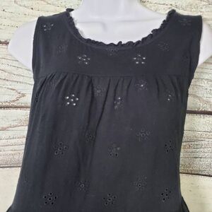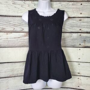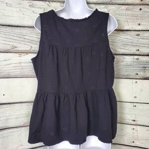 Maurices women’s sleeveless black eyelet peplum top in size XXL. Features floral embroidered eyelet details throughout, round neckline, and flowy peplum hem for a flattering fit. Made from a breathable cotton base with polyester embroidery.