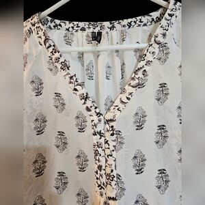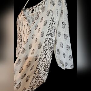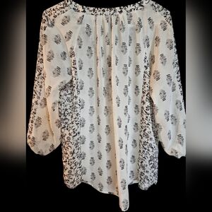 Maurices Size Medium, Stylish women's blouse featuring a black and white print. Perfect for casual outings or a day at the office. Blouse has a V-neck with decorative buttons. Elastic sleeves and in great shape. This blouse is a bit see-through, I would recommend wearing a tank top underneath. 100% Polyester. Great Condition. Color may vary due to camera lighting.