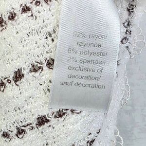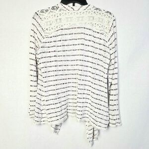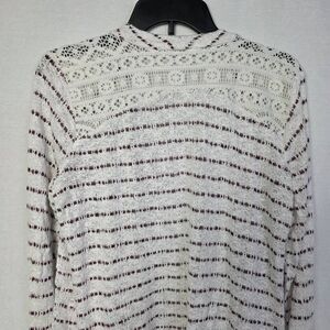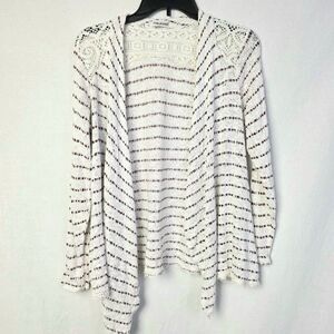 Maurices open front cardigan sweater in cream with maroon stripe accents. Lightweight knit with lace back detail. Fabric: 92% rayon, 6% polyester, 2% spandex. Size 0 (XS).