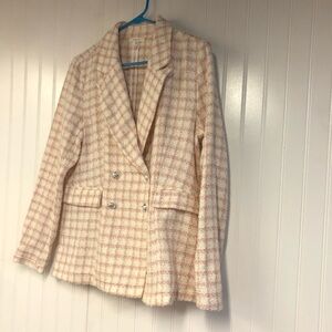 Stylish cream and pink checkered blazer. Features double-breasted design. Ideal for versatile wear.