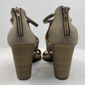 Maurices Womens Dark Tan Elsy Suede Faux Leather Arrow Sandals Block Heels Sz 6M