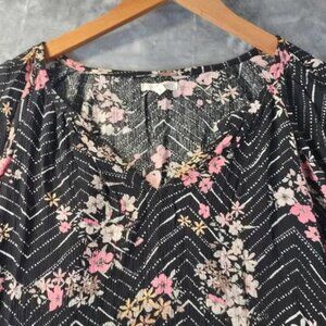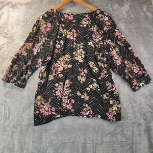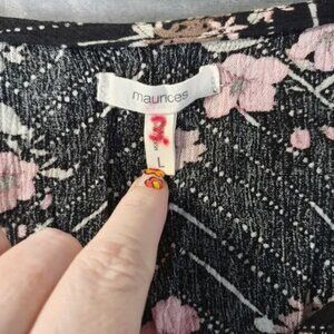 Maurices Womens L Black Floral Top 3/4 Sleeve Rayon Chevron Boho Cottage Blouse
