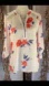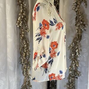 Sheer ivory floral blouse with red & blue blooms, zip V-neck, and stylish collarbone cutouts. Light and airy—perfect for boho chic, romantic, or coastal grandmother looks.