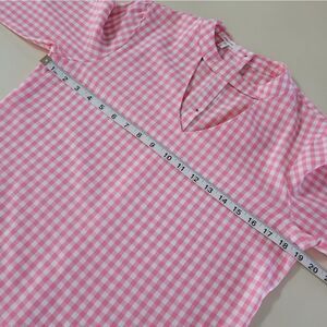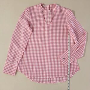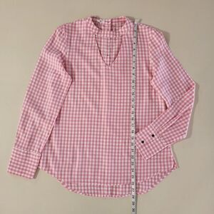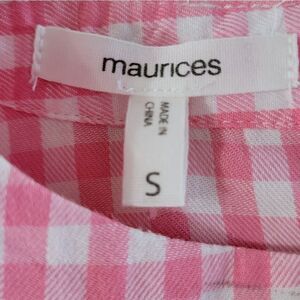 Pretty up your jeans with this button-back pink gingham top from Maurices. The v cut-out neckline adds a feminine touch so you can dress it up or down! Long sleeves and a drop-tail hem, it is also ultra light, wearable and layers like a dream. Top in new condition.