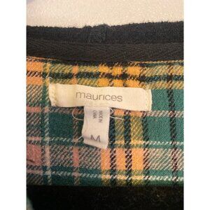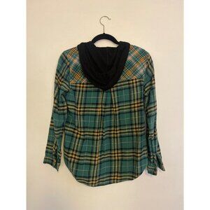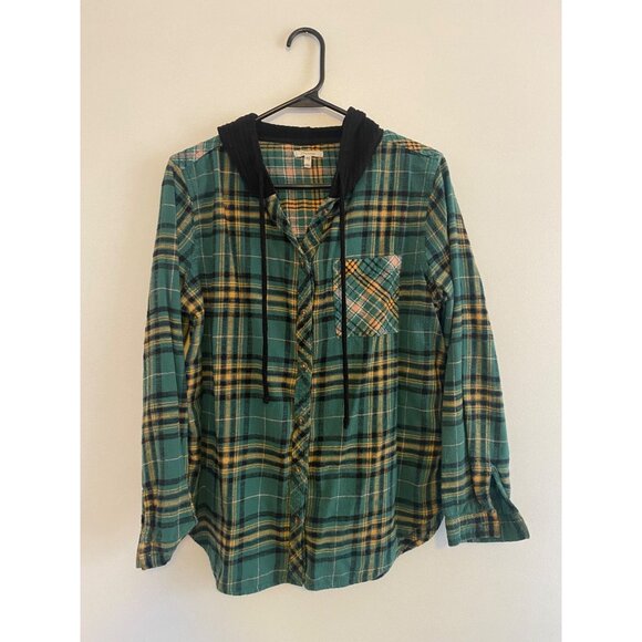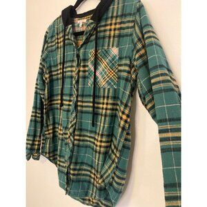 Maurices Women’s Plaid Button-Up Hoodie Shirt Green With Black Hood Size M