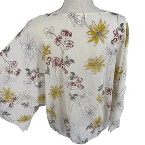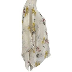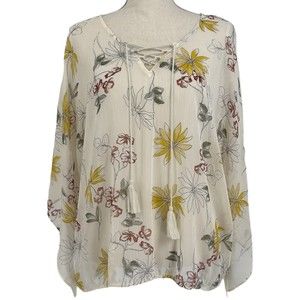 Maurices 0 Sheer Floral Print Lace Up V Neck Kimono Top Womens Plus Size 14W. Thin, crinkle textured, see-thru, lightweight, polyester fabric. Needs a layering piece underneath. Tasseled Lace-up neckline. Elastic waist. Ivory cream color with multicolor flowers.