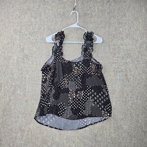 Maurices Women's sleeveless tank top in black with white polka dots and floral accents. Made from lightweight 100% rayon, featuring ruched straps and a casual design. Pre-owned in good condition.