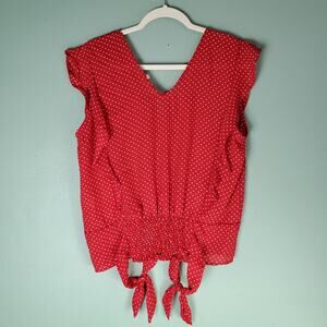 Maurices Womens Red Polka Dot Ruffle Short Sleeve V-Neck Tie Blouse Size Large