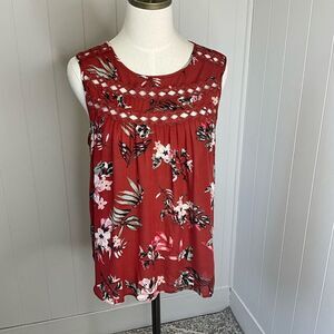 Maurices Womens Size Large Pullover Top Red Floral Sleeveless Diamond Cutouts Size Large Excellent Pre-owned Condition Ships Fast Comes from a smoke free home Please see photos for measurements and fabric content.
