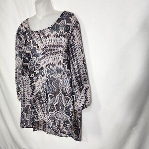 Maurice's Womens Tunic Top Size XL Criss Cross Back Sheer Geometric Hi low Hem
