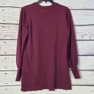 Add a touch of cozy elegance to your wardrobe with this burgundy open front cardigan from Maurices. Made from a soft rayon-blend fabric, this lightweight knit features long puffed sleeves with ribbed cuffs, front patch pockets, and a relaxed silhouette. Perfect for layering during cool weather or transitioning between seasons.