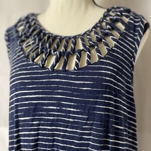 Very stretchy top with unusual neckline (semi sheer) and a tie hem on one side. Navy blue and white with uneven stripes.