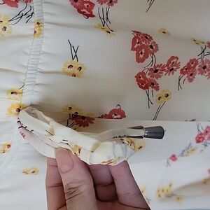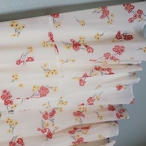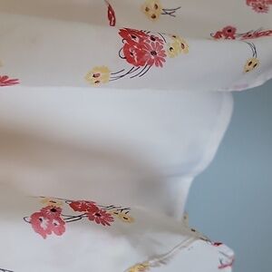 White floral dress. Pretty lace detail at the shoulders. Faux drawstring at the waist. Elastic at the waist. Dress is lined. Keyhole opening in back with single button closure. Tireed look. Dainty, event, wedding, dance, occasion, cottage, prairie, girly sweet, twee, romantic, dinner, date night, church, spring, summer, office, workplace