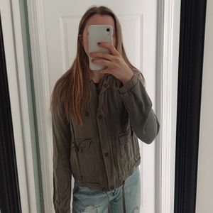 Army Green Zip/Button light jacket. Very cute and can dress up. One of my favs with a black cami underneath. Just doesn’t fit as well anymore but definitely still has lots of life left to it.