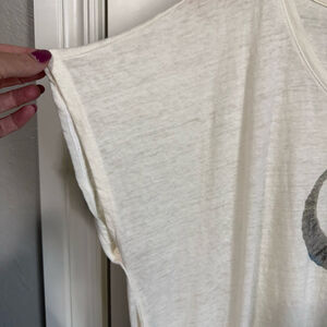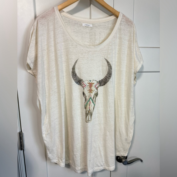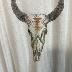 Chic ivory tee from Maurices. Perfect for casual Add a touch of western boho style to your wardrobe with this soft and lightweight Maurices graphic tee. Features a faded bull skull design with colorful Aztec-inspired detailing on a cream/off-white background. Relaxed fit with dolman-style short sleeves and scoop neckline — perfect for pairing with jeans, cutoffs, or layering under a denim jacket.