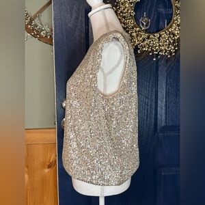 Sparkle with this chic sequin top. Features padded shoulders for a bold look. Ideal for evening wear. I would call this a champagne color.