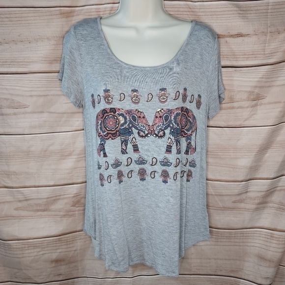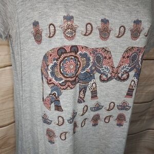 Maurices graphic tee in heathered grey with mauve pink light blue white cream brown metallic elephant print, size M. Style 18072.