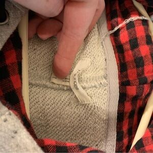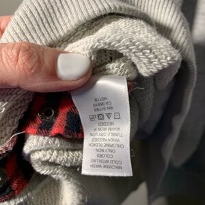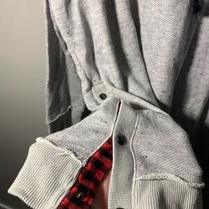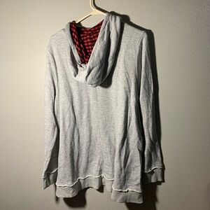 Maurices gray pullover cowl neck top - tunic length - women's size 1, for Maurices this is a 16W/18W (Bust 43-1/2-45). Red & black plaid accent, button sides