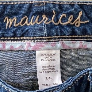 Maurice's original jeans Maurice's Jeans Straight Leg Size 3/4 Long factory fading and light distressing 99% cotton 1% spandex excellent condition measurements are approximately in inches waist 16” rise 8” inseam 34” hips 19” poshmark.com/closet/mamajoe43