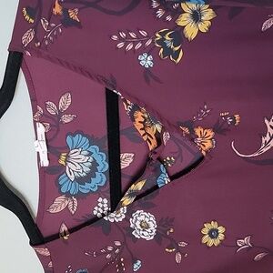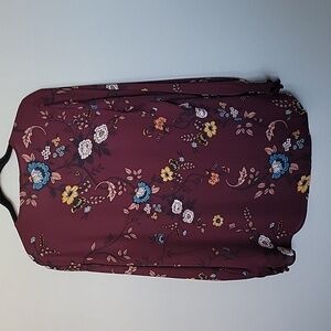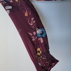 Lightweight fabric, doesn't stretch. Burgundy/maroon almost purple color. Has blue peach yellow and orange florals. Smocked at the wrist. Strappy detail at the chest. Sheer. Great condition. Fall, autumn, vamp, moody floral, botanical, office, workplace, career, dinner, date night, career, feminine, girly